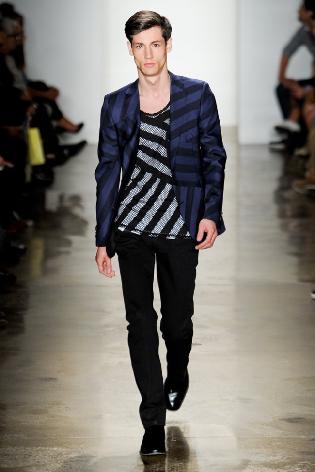 Simon Spurr Spring / Summer 2012 Menswear collection. Staying true to what he does so amazingly, he takes suiting for a modern twist. Mixing tailored and casual pieces, the looks also has a very graphic-like quality to them. Also, an interesting use of materials such as leather mixed with mesh as well as a study in proportions complete the story of the Spurr man.