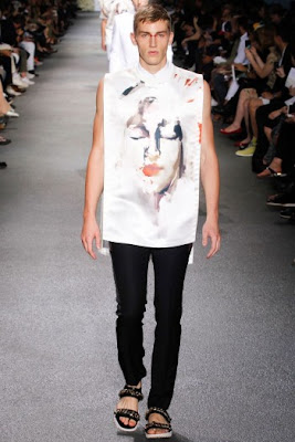 Welcome to Ricardo Tisci's vision of the "Church of Fashion" in the Givenchy Spring / Summer 2013 Menswear runway. Definitely elevating the high-end street wear aesthetic the brand has cultivated over the last couple of seasons, I'm obsessed with the play on the suiting (silhouette and length) and the stylistic layering of the looks. Lean and long tunics under sleeveless suit jackets are definitely a look I'm looking to "borrow" and am loving the fabric mixing from organza to satin. The resulting offering is a perfect blend of androgynous and almost monastic "middle eastern" styling. The use of the light pink and the Italian Renaissance catholic icon style painting prints (even with the halos!) are pretty unexpected!